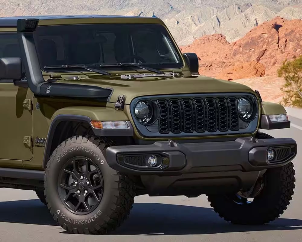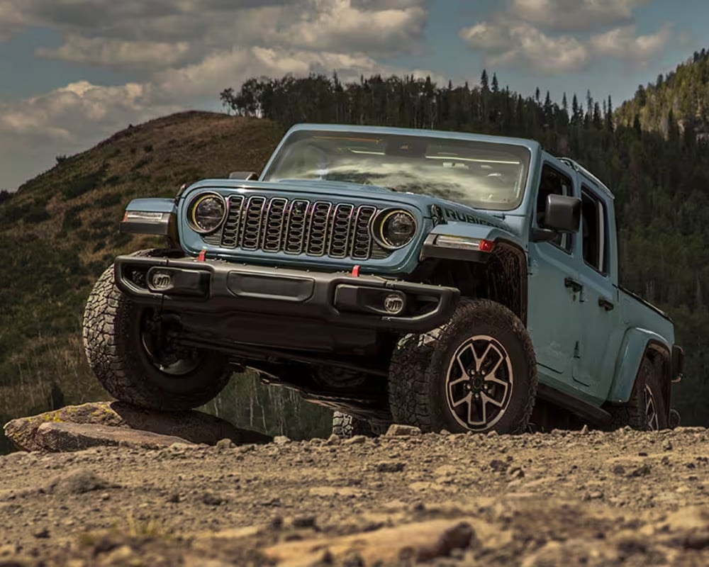 The 2025 Jeep Gladiator stands out wherever it goes. The iconic seven-slot grille now has a modern twist, adding a more aggressive edge. LED headlights and fog lights enhance visibility and style.