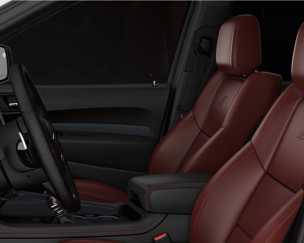 For those who crave more power, the R/T delivers with its 5.7-litre HEMI V8 engine generating 360 horsepower. This trim also features performance-tuned suspension, a sport steering system, and bold HEMI badging. The exterior gets an aggressive edge with black grille accents and dual exhaust tips, while the interior offers perforated leather seating and Dodge performance pages for a sportier experience.